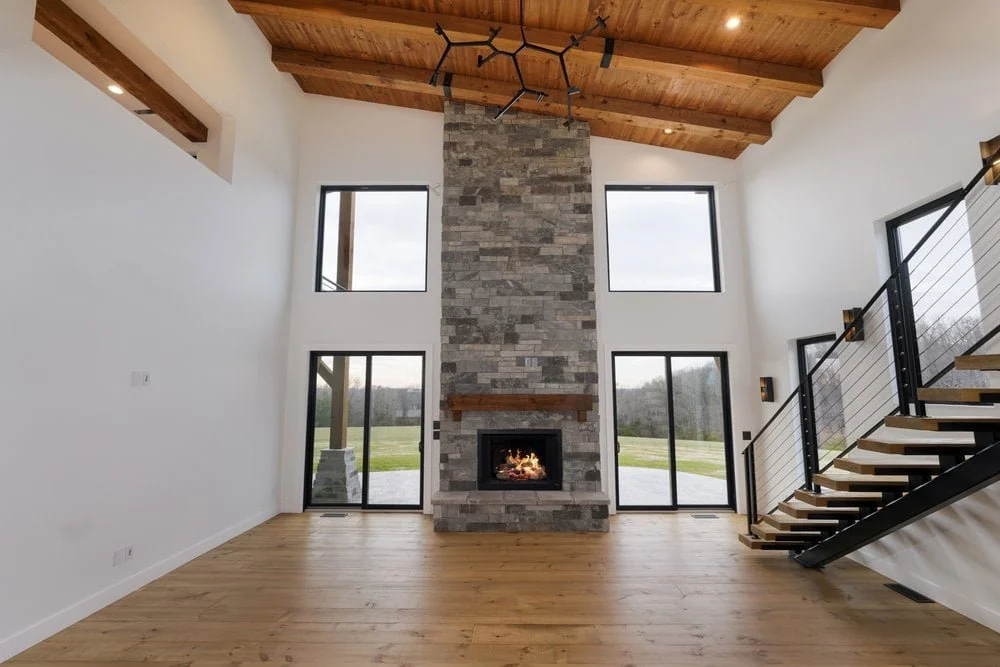 Modern Mountain is a custom contemporary home that blends mountain-inspired architecture with clean, minimalist design. Set in the hills of Clever, Missouri, this luxury home features dramatic rooflines, dark modern siding, and expansive black-framed windows that create a strong connection between indoor and outdoor living. Its bold silhouette and natural textures deliver a timeless balance of form and function.